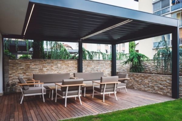 Si sólo quieres utilizar el espacio exterior durante el verano, un toldo grande y elegante podría ser suficiente, pero si tu plan es crear una habitación adicional para utilizarla durante todo el año, entonces una estructura con cerramientos perimetrales de cristal podría ser la opción más adecuada.
